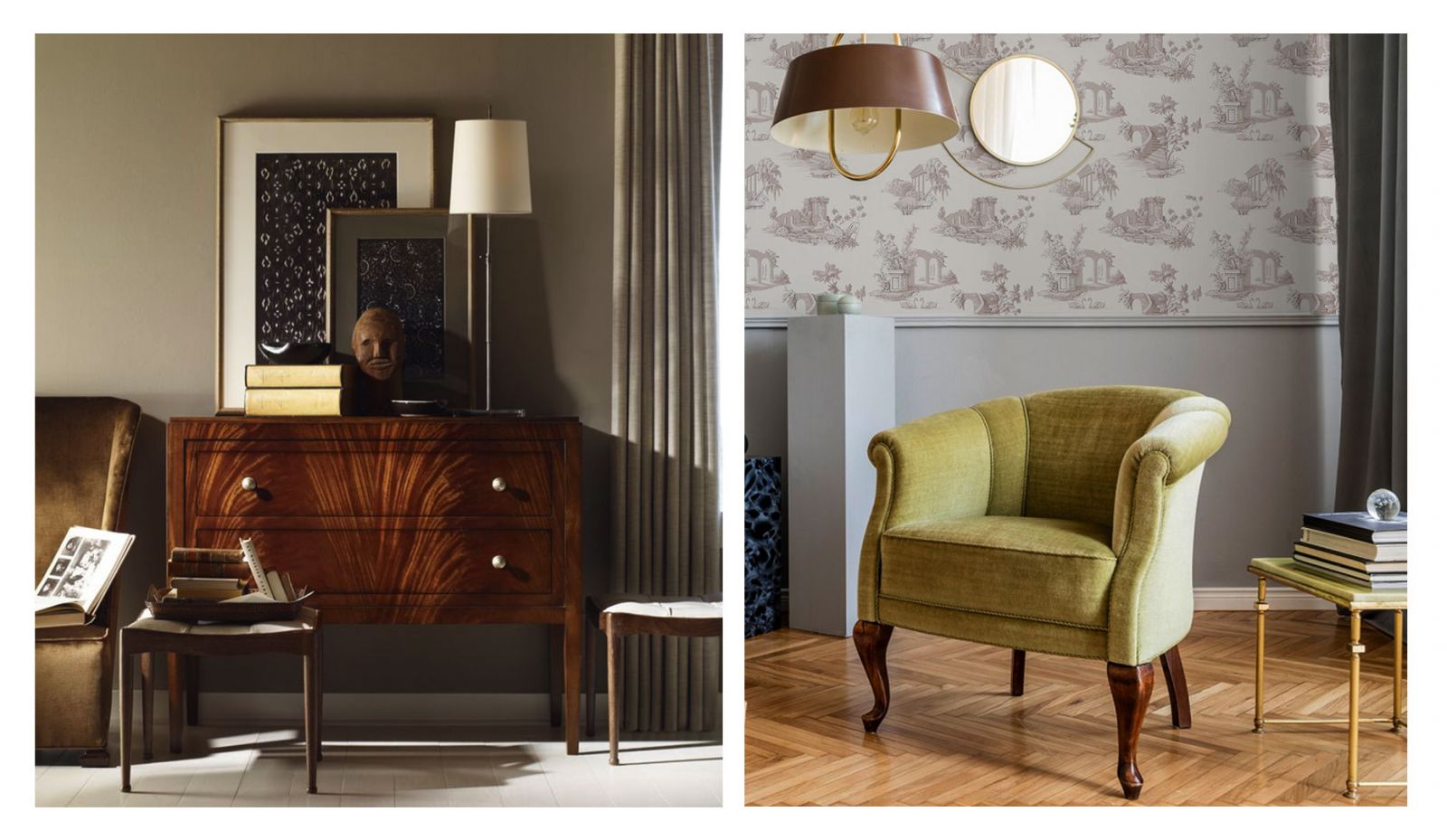 - Благородные натуральные материалы и никакого пластика. Красное дерево, дуб, орех используются как в отделке пространства, так и в изготовлении мебели. В текстиле отдаётся предпочтение бархату и шёлку. Если обои, то тканевые, бумажные, экологичные альтернативы.