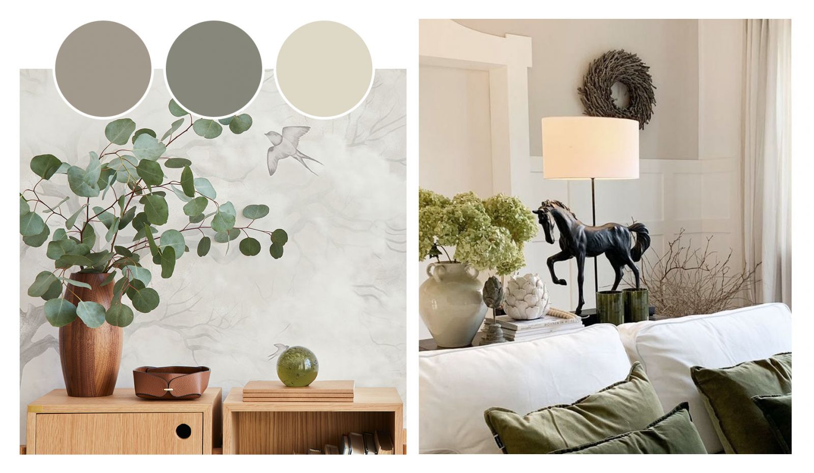 Акценты в переходном интерьере выразительны, но в то же время сдержанны. Идеально подойдут природные зелёные, синие и коричневые оттенки. Главное, чтобы они не конкурировали между собой, использовались дозированно и не нарушали общую целостность мягкой цветовой гаммы пространства.