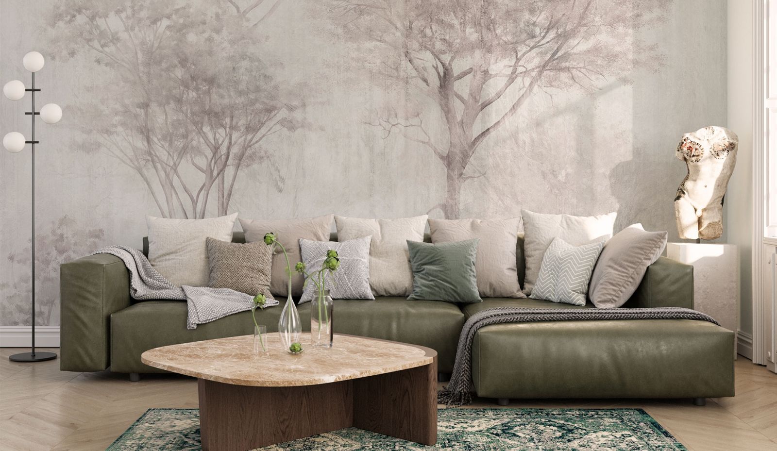 Как правило, стены в переходном стиле являются лёгким ненавязчивым фоном. Из материалов предпочтение отдаётся фактурной штукатурке, декоративному кирпичу с эффектом натуральной кладки, деревянным панелям. Чтобы привнести ту самую индивидуальность и изюминку в переходный интерьер, отличным выбором станут обои с лёгким ненавязчивым сюжетом. Гармоничные цветовые вариации, дизайнерские сюжеты на любую тематику (будь то классические узоры и вензеля или та же имитация природных текстур) позволят создать оригинальный акцент на определённой зоне вашего пространства, наполнят его смыслом и оригинальностью. К тому же, они максимально экологичны, подходят для размещения в спальнях и детских комнатах.